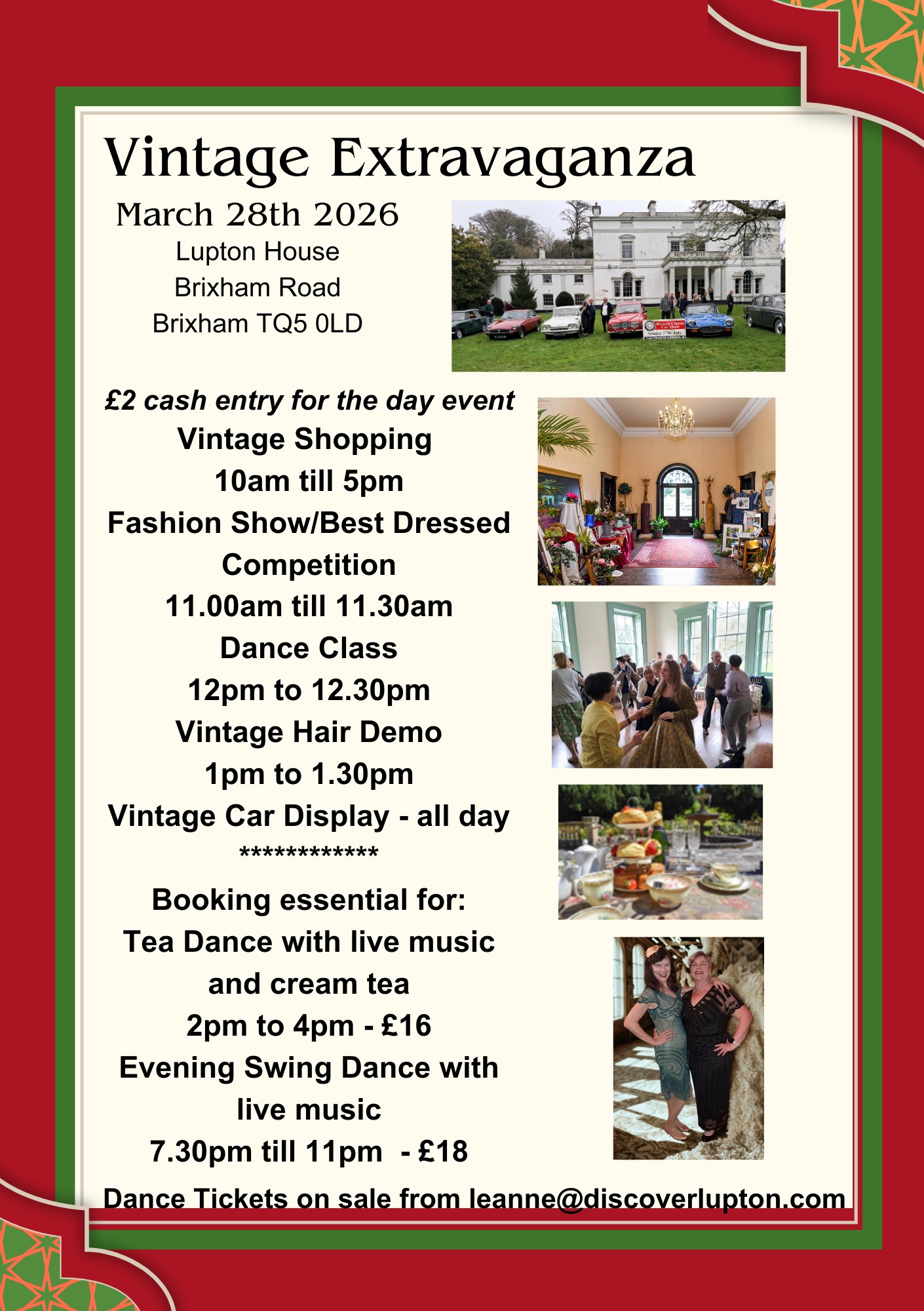 ** Bookings and prices of the afternoon tea dance and evening swing dance are taken by emailing: leanne@discoverlupton.com